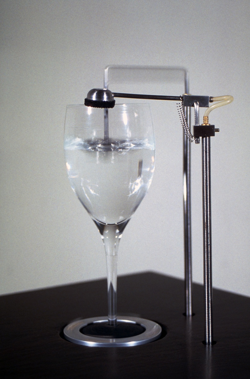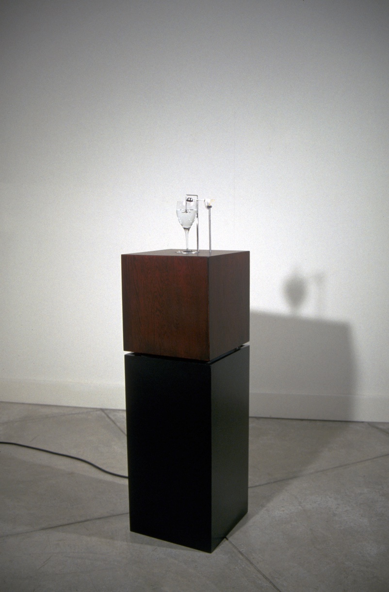 Medium: Wine glass, wood, stainless steel, motors, water pump, timer and water. Dimensions: L 13” x W 13” x H 46”