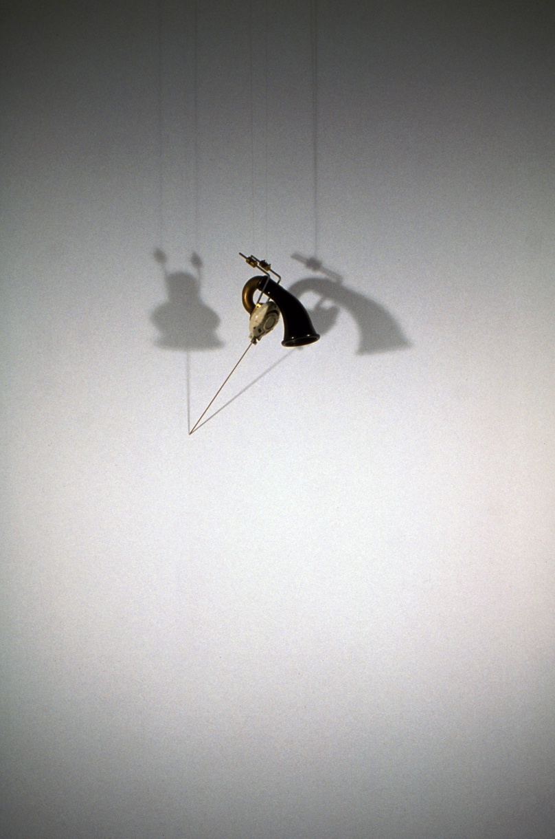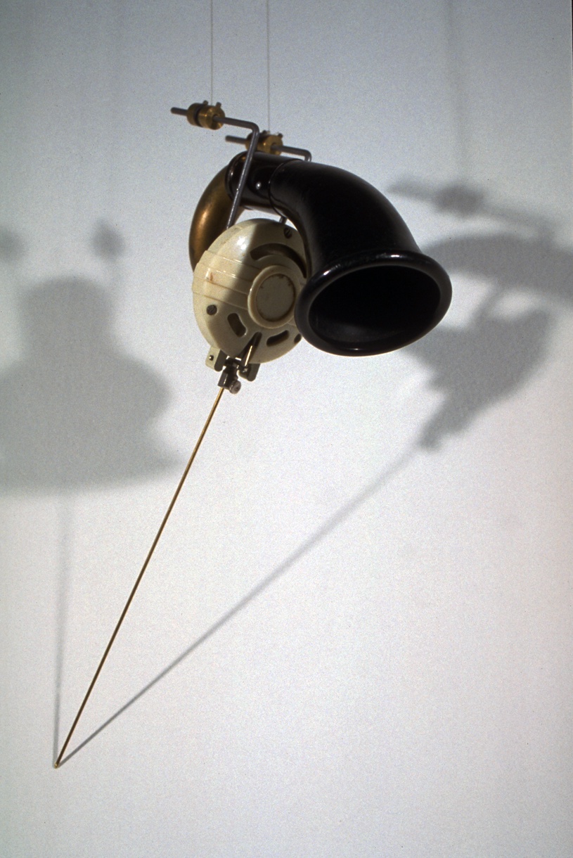 Phonograph head and horn, motors, timers, twine and steel. Dimensions: L 6’ x W 5” x H 13’ A phonograph head is slowly dragged up and down a wall, amplifying the texture of the wall.